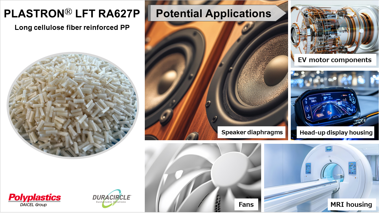 本公司开始销售使用了低PCF(产品碳足迹)的再生纤维素纤维制造的PP树脂PLASTRONⓇ LFT RA627P 。由于该材料具有高损耗系数,基于该特点,我们认为除了扬声器振膜等音响设备零部件与乐器零部件以外,本产品还适用于具有旋转体、振动部位或者暴露于振动中的设备的外壳和构件(例如电动汽车电机周边零部件、平视显示器外壳、各种风扇、MRI设备外壳)等,并将致力为广泛领域的产品提供材料方案。此外,本公司还在开发一种使用再生PP树脂的新品级,以期进一步减少PCF(产品碳足迹)。今后,为了进一步满足市场需求,我们将扩大PLASTRONⓇ LFT产品组合,与客户携手并肩,为加快实现循环型社会做出贡献。